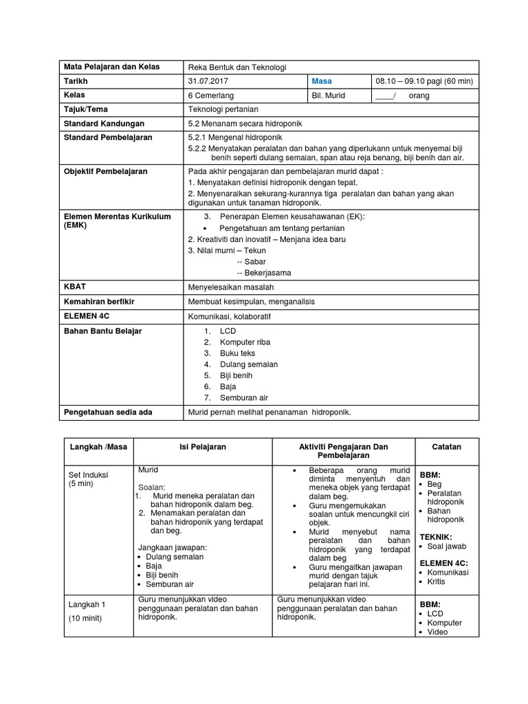 Rbt Tahun 6 Teknologi Pertanian Hidroponik Kelas Live